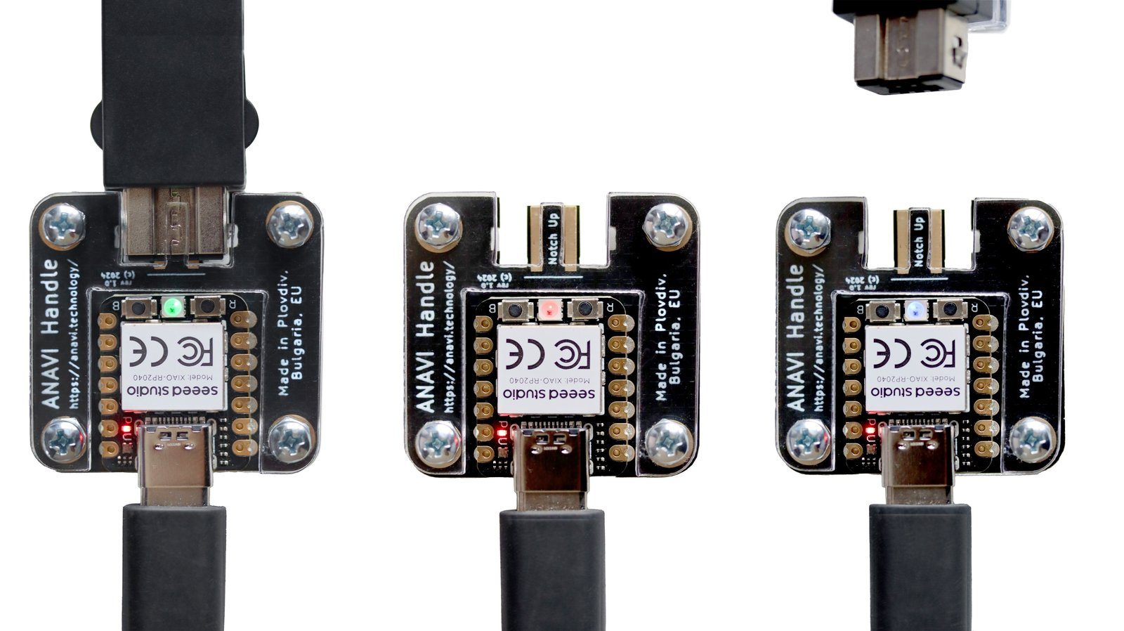 The open-source firmware includes support for detecting whether a controller is connected to ANAVI Handle. An onboard RGB LED provides clear visual feedback through three distinct states: