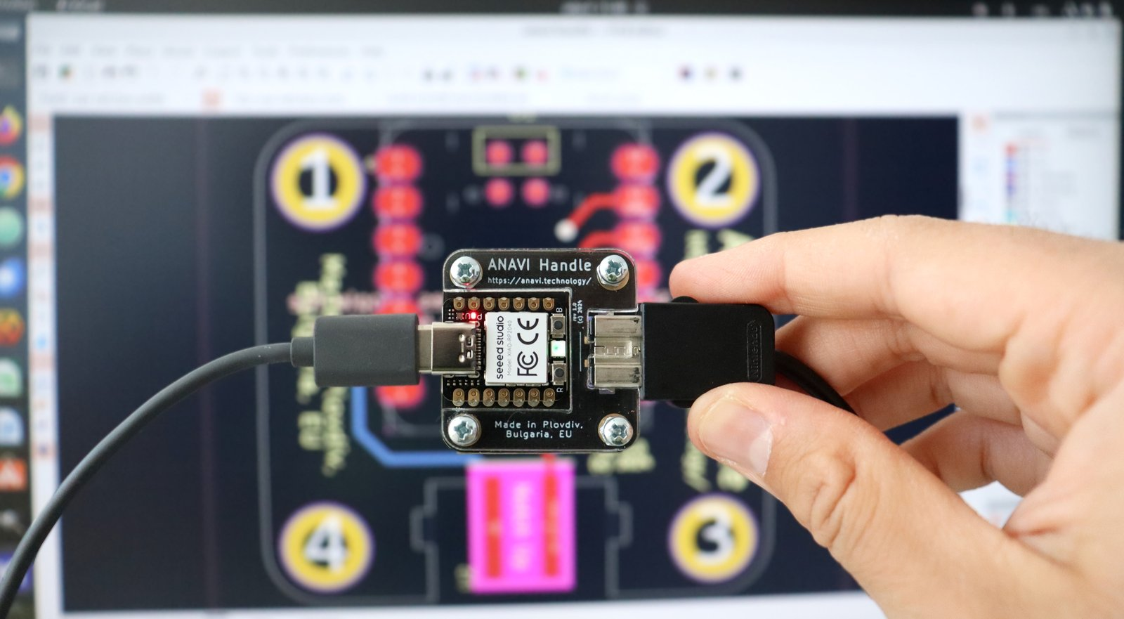ANAVI Handle is a fully open-source project that brings together open-source hardware and free, open-source software. Both the printed circuit board and the acrylic enclosure were designed using KiCad, an open-source electronic design automation (EDA) suite available for Windows, macOS, and GNU/Linux.