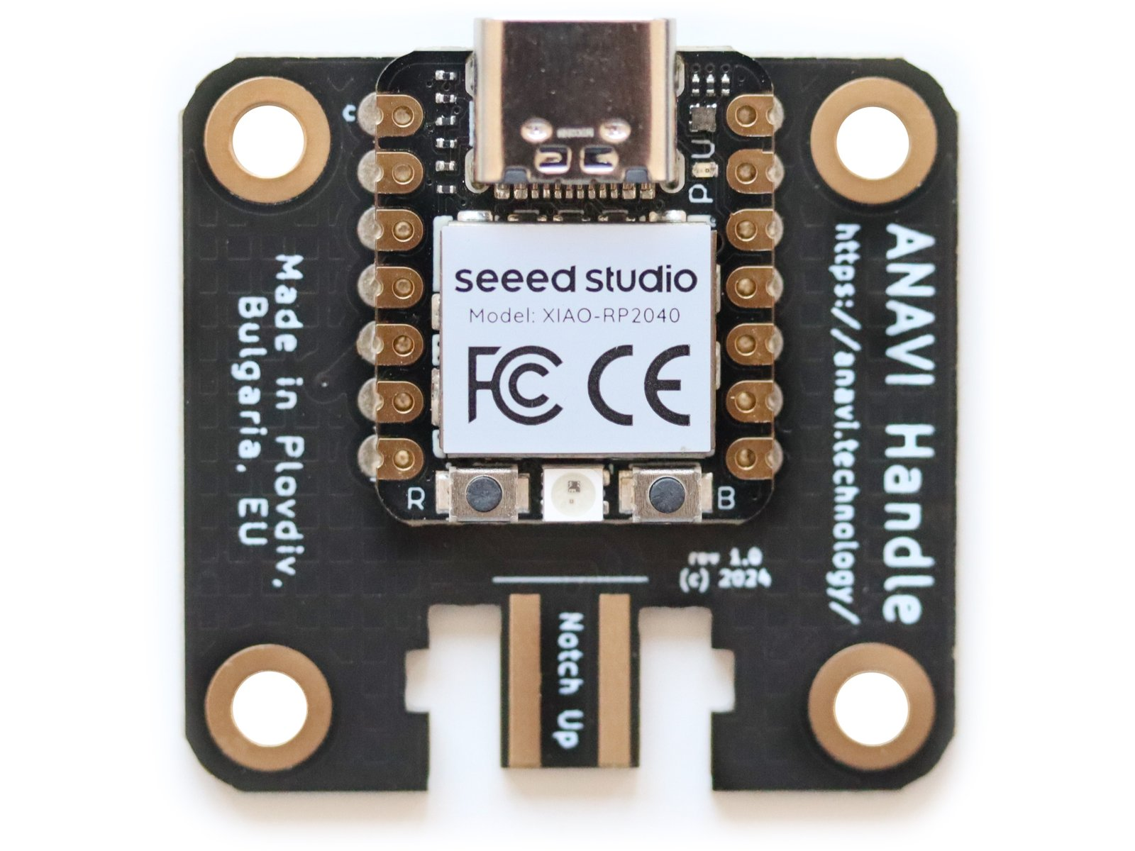 ANAVI Handle boasts a compact design with a black, gold-plated printed circuit board with the cutting-edge Seeed Studio XIAO RP2040 module. Here are the technical specifications: