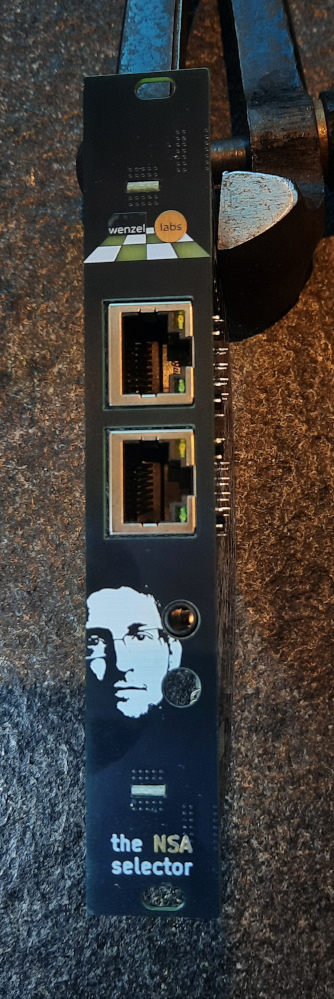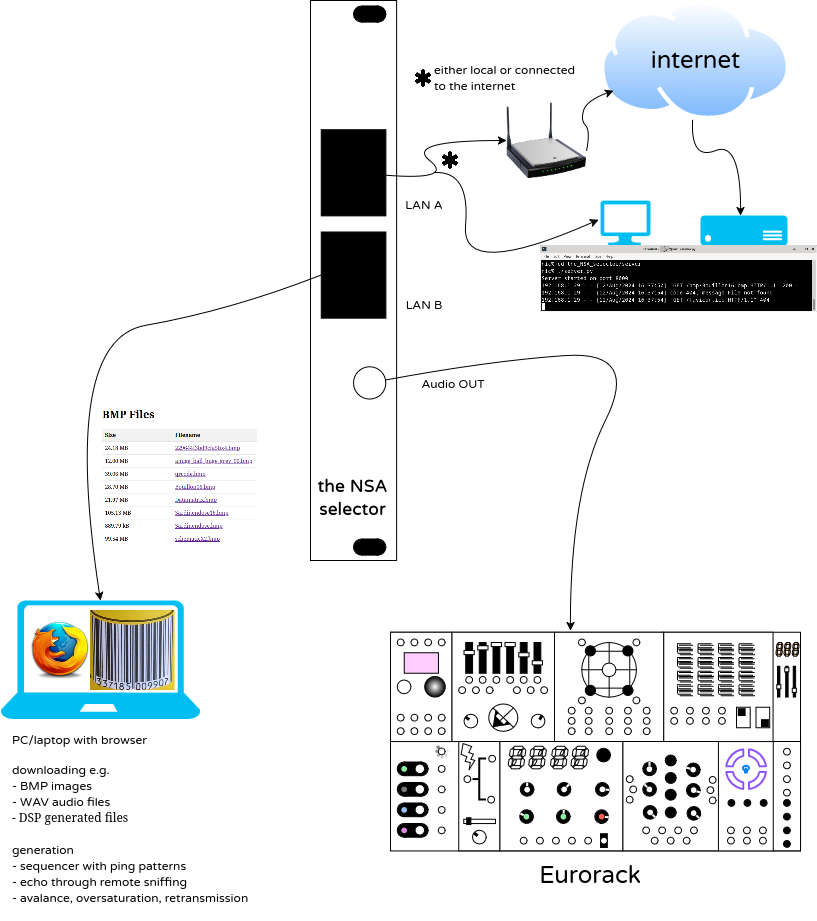 the NSA selector is a eurorack module with two ethernet jacks and one audio output. any bit on the network will be sent to the audio output.