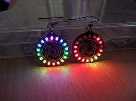 RGB LED earrings for festivals, parties, raves, hacker events, etc. Each earring weighs about 1.8g, or 2.8g including the battery. This is comparable to most earrings.
